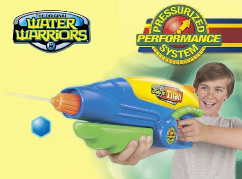 NEW FOR 2011! Looking for a compact, powerful water blaster? If so, the Water Warriors Titan is a must have. It's great fun for water fights and surprise attacks. The special air pressure performance system of the Titan lets you blast water up to 40 feet out. The Titan produces a decent-size, smooth stream from its single nozzle. It offers decent soaking capabilities for the typical user. The pump on the Water Warriors Titan is semi-tracked and pumps smoothly.The pump grip, itself, offers rounded ridges, offering a more defined area for one's hand to hold. Pressurizing the reservoir does not take too long and keeping the blaster optimally pressurized during use is easy to achieve. Due to the size of the Titan, this is more of a two-handed blaster with the pump grip being the forward point of support when the blaster is fully loaded. The trigger on the Titan pulls smoothly; its nozzle valve responds well to pulls on the trigger. For best results, prime the gun before use. he refill tank is positioned so you can easily refill it on the go. The Titan's reservoir holds a respectable amount of water for a water blaster of its size. This gives the Titan a very respectable soaking potential. The reservoir is closed by the standard plastic-ring-tethered cap which works well so long as it is tightened properly. The Titan holds up to 37 oz of water and weighs almost 1 3/4 lbs when empty and 3 3/4 lbs when fully filled. NOTE: The Titan is suitable for younger children (Ages 5+). For a larger, more power version, check out the Water Warriors Sphynx (Ages 8+). Check out our complete selection of water toys including water balloons, water grenades and waterproof watches. No batteries are required. Shipping weight 3 lbs.