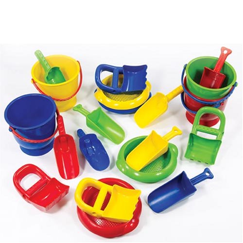 - Rugged plastic sand set includes a total of 20 pieces - four 7" high buckets with handles, and four each: shovels, hand diggers, scoops with handles, and large sieves